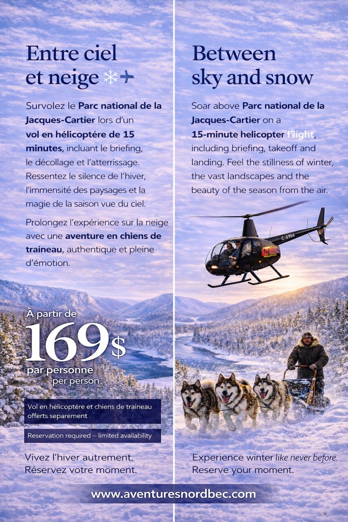 Découvrez le Parc national de la Jacques-Cartier comme très peu de gens ont la chance de le voir. Ce vol en hélicoptère vous offre une perspective spectaculaire sur les vallées enneigées, la rivière gelée et l’immensité de la forêt boréale. Une expérience courte, intense et mémorable, idéale pour un moment unique en couple, en famille ou entre amis.